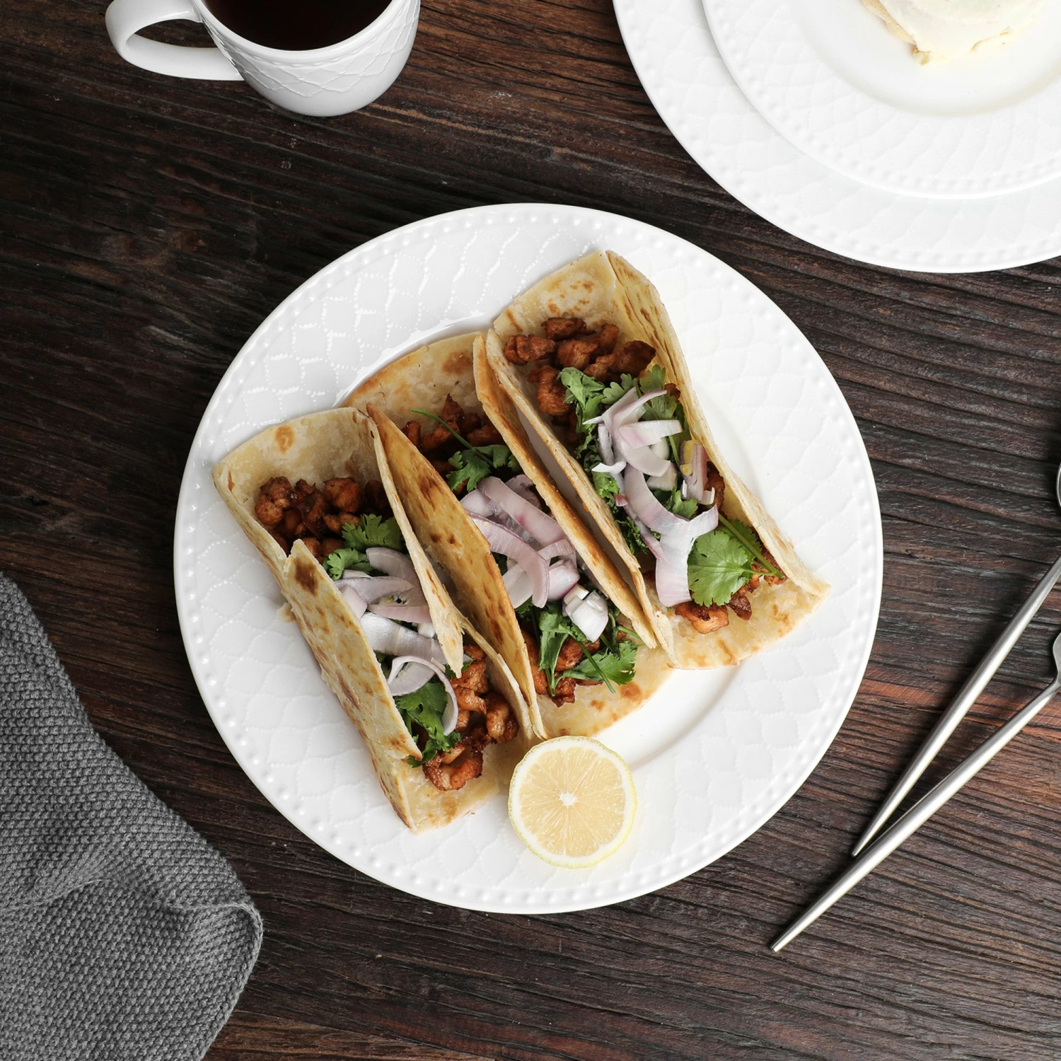 This classic set of white bone china tableware includes large 10.5โ round dinner plates, classy 8โ round salad plates, deep 6″ round bowls and 13 oz. mugs. Reminiscent of royal sets of china, these home essentials are expertly crafted and artfully designed. 100% dishwasher and microwave safe for easy cleaning and durability. The elegant weave detailing borders each dish in this exemplary set. These pieces go great in either a formal or casual setting. Lay out your favorite tablecloth, cutlery, and stemware, and let the Stone Lain bone china dishes set do the rest. Thank you for choosing Stone Lain, where dishes come true.