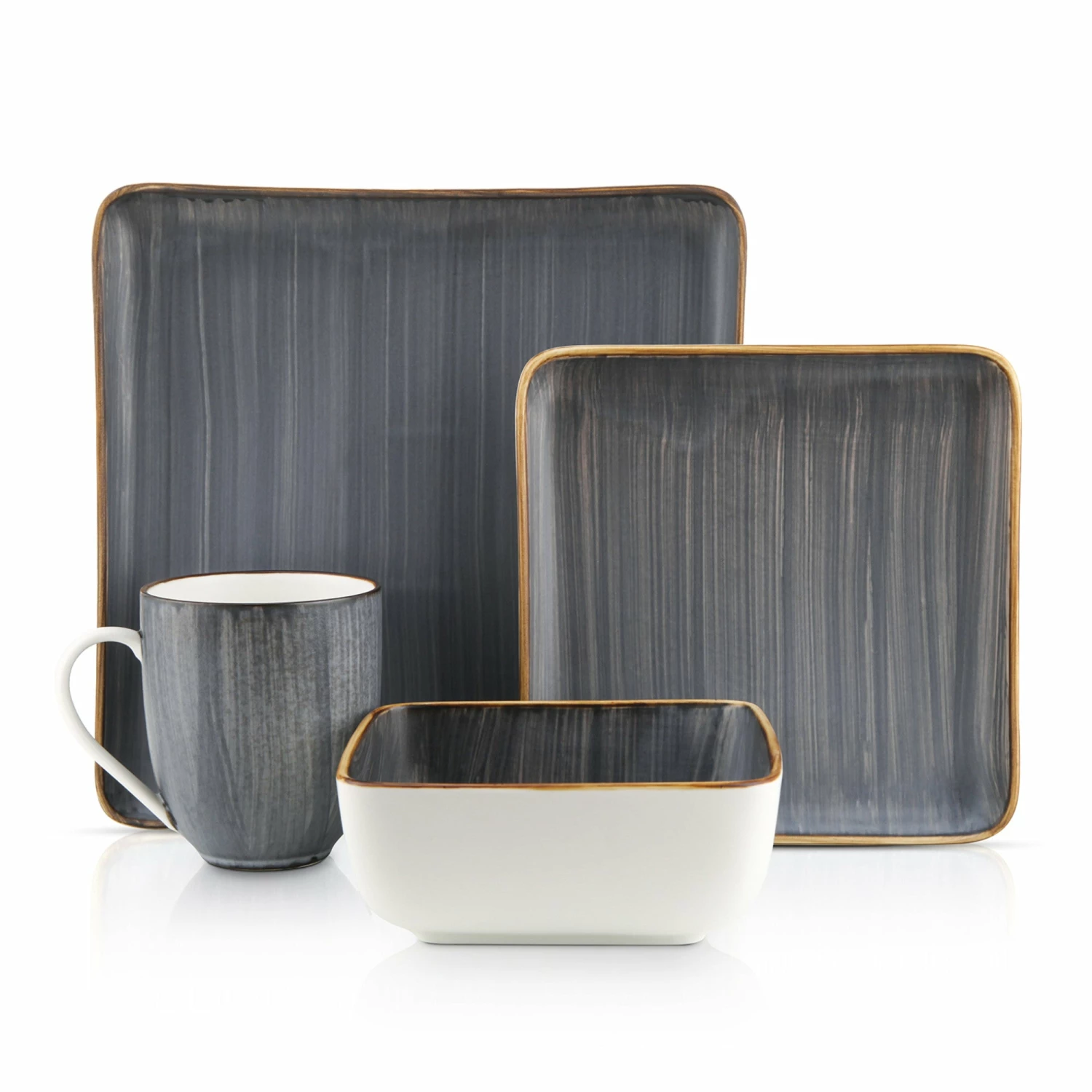These porcelain tableware settings are finished with a brushed design. Includes large square dinner plates, trendy square salad plates, deep square bowls and square 12 oz. mugs. These home essentials are expertly crafted and artfully designed. 100% dishwasher and microwave safe for easy cleaning and durability. The hip, trendy design pairs exquisitely with both formal and casual cutlery, as well as with your favorite glassware and tablecloths.