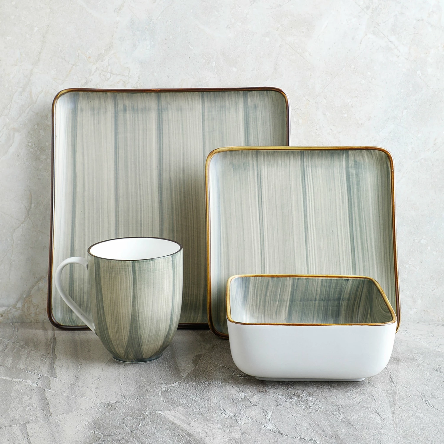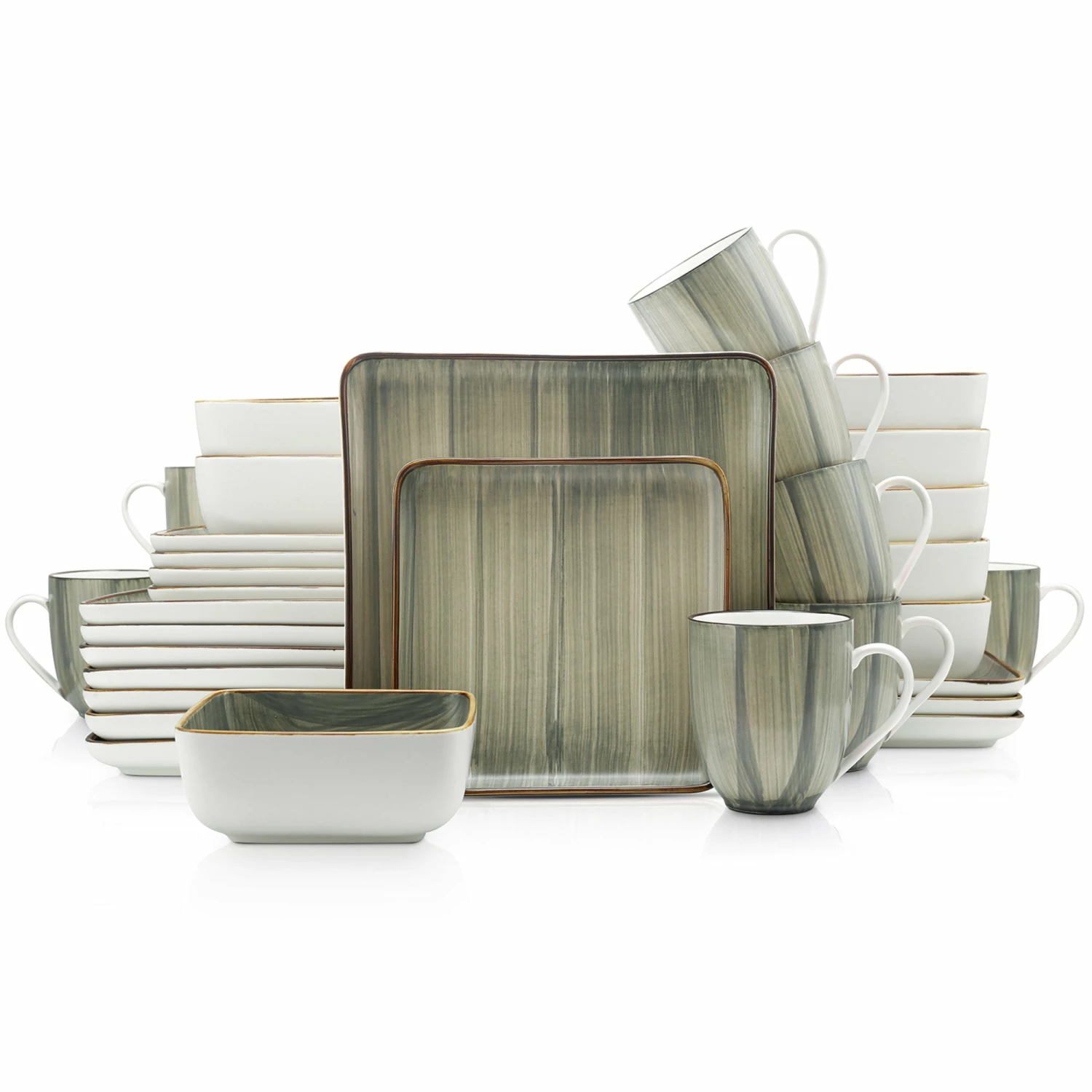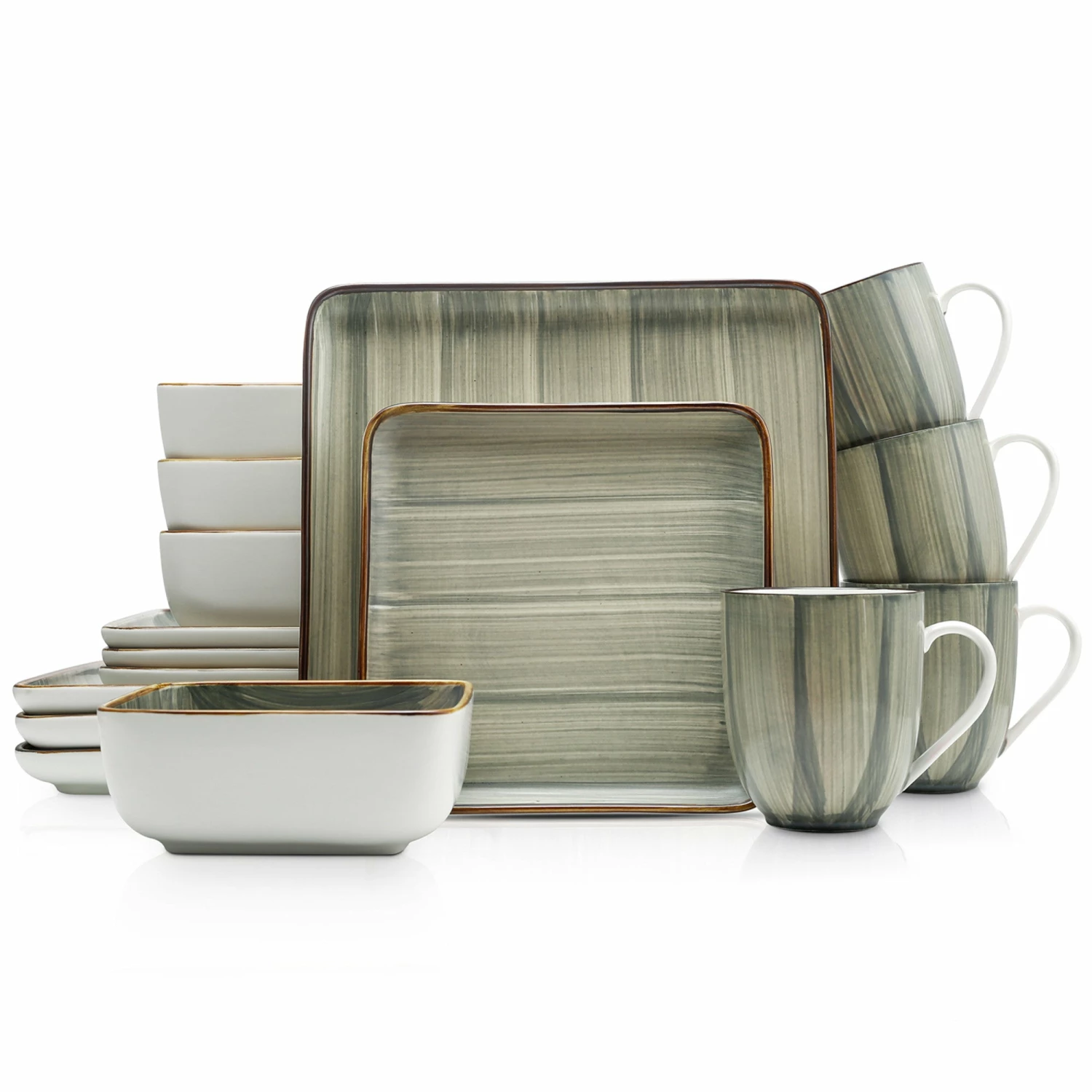 These porcelain tableware settings are finished with a brushed design. Includes large square dinner plates, trendy square salad plates, deep square bowls and square 12 oz. mugs. These home essentials are expertly crafted and artfully designed. 100% dishwasher and microwave safe for easy cleaning and durability. The hip, trendy design pairs exquisitely with both formal and casual cutlery, as well as with your favorite glassware and tablecloths.