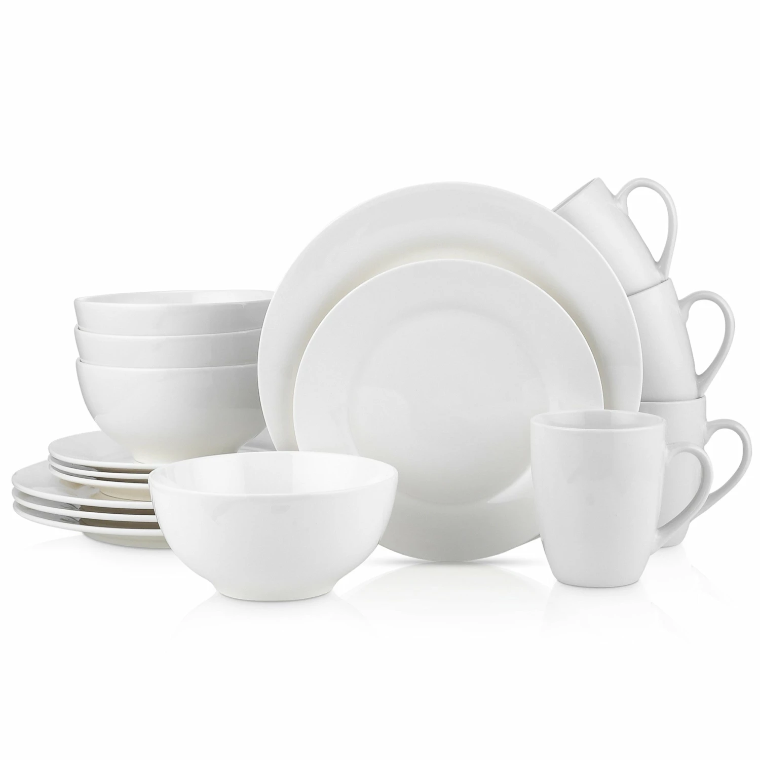 Evermore Dinnerware Set includes complete place setting. This modern set of white porcelain tableware comes with large round 10โ dinner plates, classy round 8โ salad plates, deep round 6โ bowls and rounded 12 oz. mugs. These home essentials are expertly crafted and artfully designed. Each piece of Evermore is 100% dishwasher and microwave safe for easy cleaning and durability. The minimal elegant design pairs exquisitely with both formal and casual cutlery, as well as with your favorite glassware and tablecloths. Makes every occasion memorable with unforgettable dinnerware.
