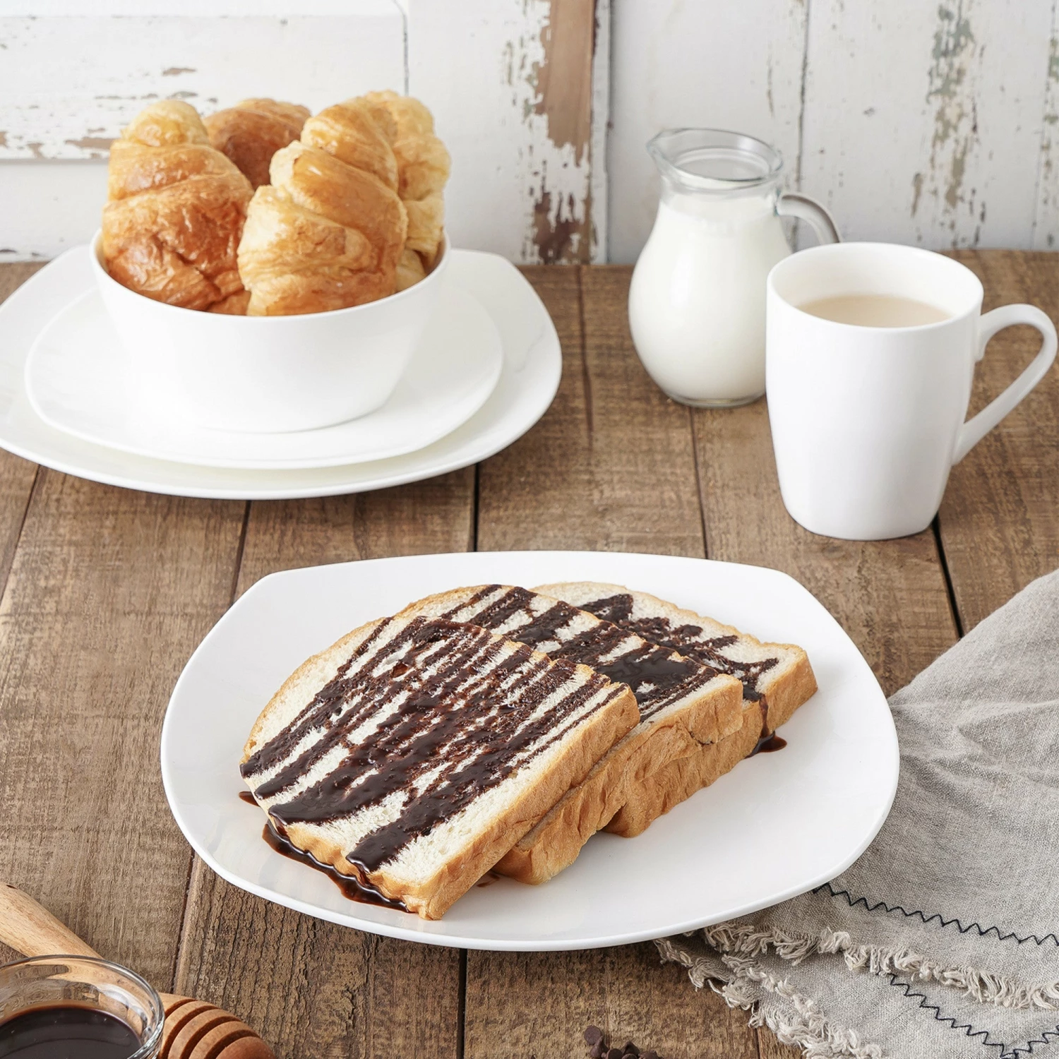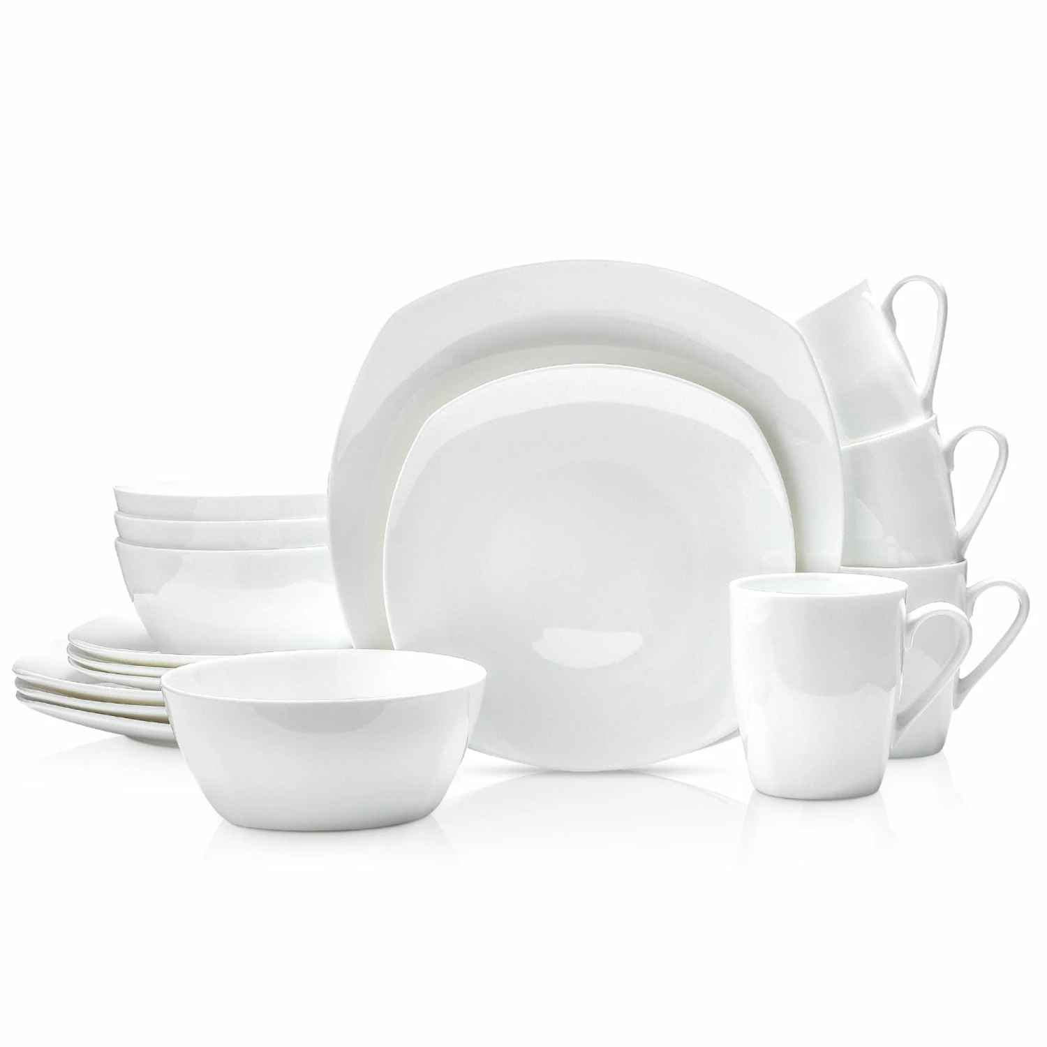 This classic set of white bone china tableware includes large square dinner plates, classy square salad plates, deep bowls and mugs. These home essentials are expertly crafted and artfully designed. 100% dishwasher and microwave safe for easy cleaning and durability. The elegant dot detailing borders each dish in this exemplary set. These pieces go great in either a formal or casual setting. Lay out your favorite tablecloth, cutlery, and stemware, and let the Stone Lain bone china dishes do the rest. Thank you for choosing Stone Lain, where dishes come true.