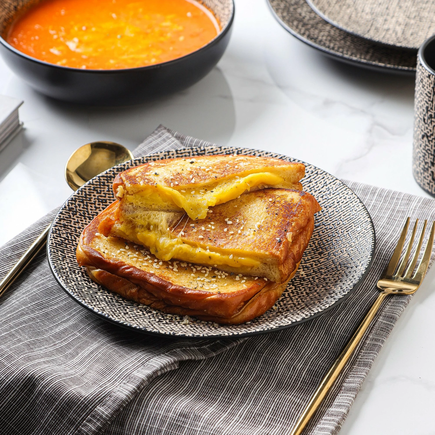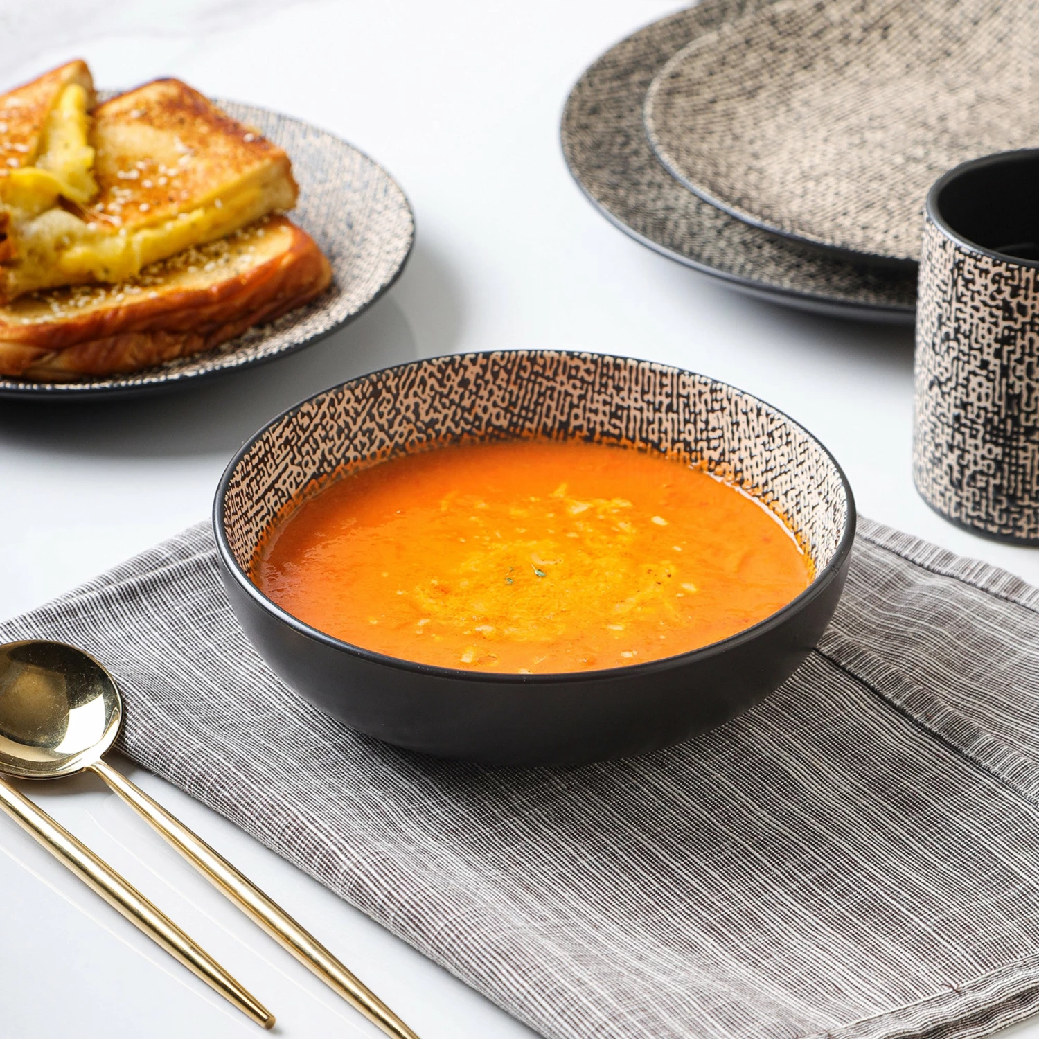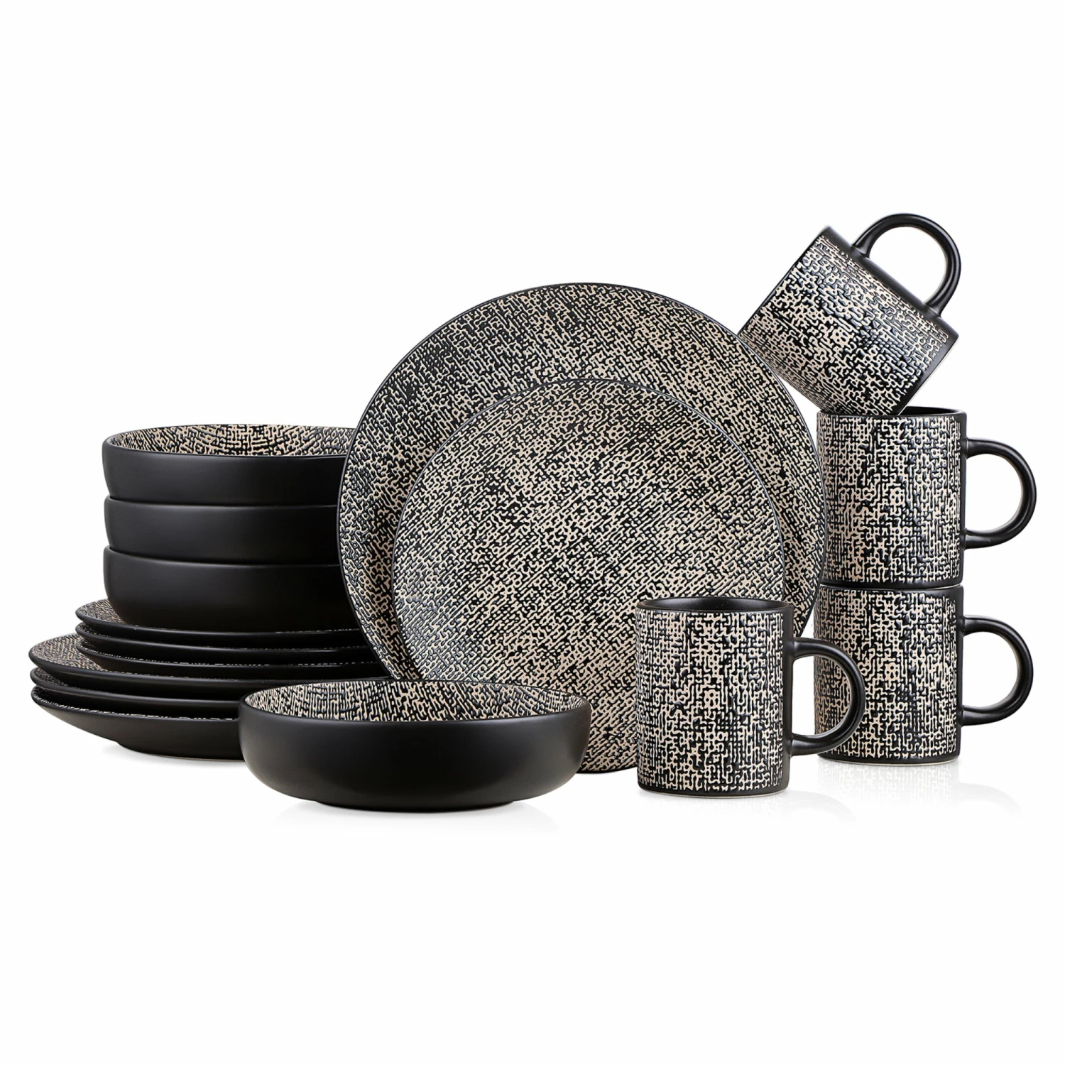The Sophie stoneware dinnerware set is rustic with a fun textured design on the inside and a thick black rim, making each dish feel artsy and unique. The Stone Lain Sophie stoneware set includes low profile black and brown dishes, that are casual enough for every day dining and a great pair to comfort food. The neutral toned dishes fit into any traditional, farmhouse, or modern home or apartment. The collection includes large round 10.5โ dinner plates, round 8โ salad plates, soup or pasta bowls and cozy 12oz cups. Pair this set with your favorite cutlery and napkins, and you are ready to plate your food for a comforting and casual dining experience. Sophie is microwave and dishwasher safe, for easy reheating and cleaning. Grab a set today and experience fun dining at home.