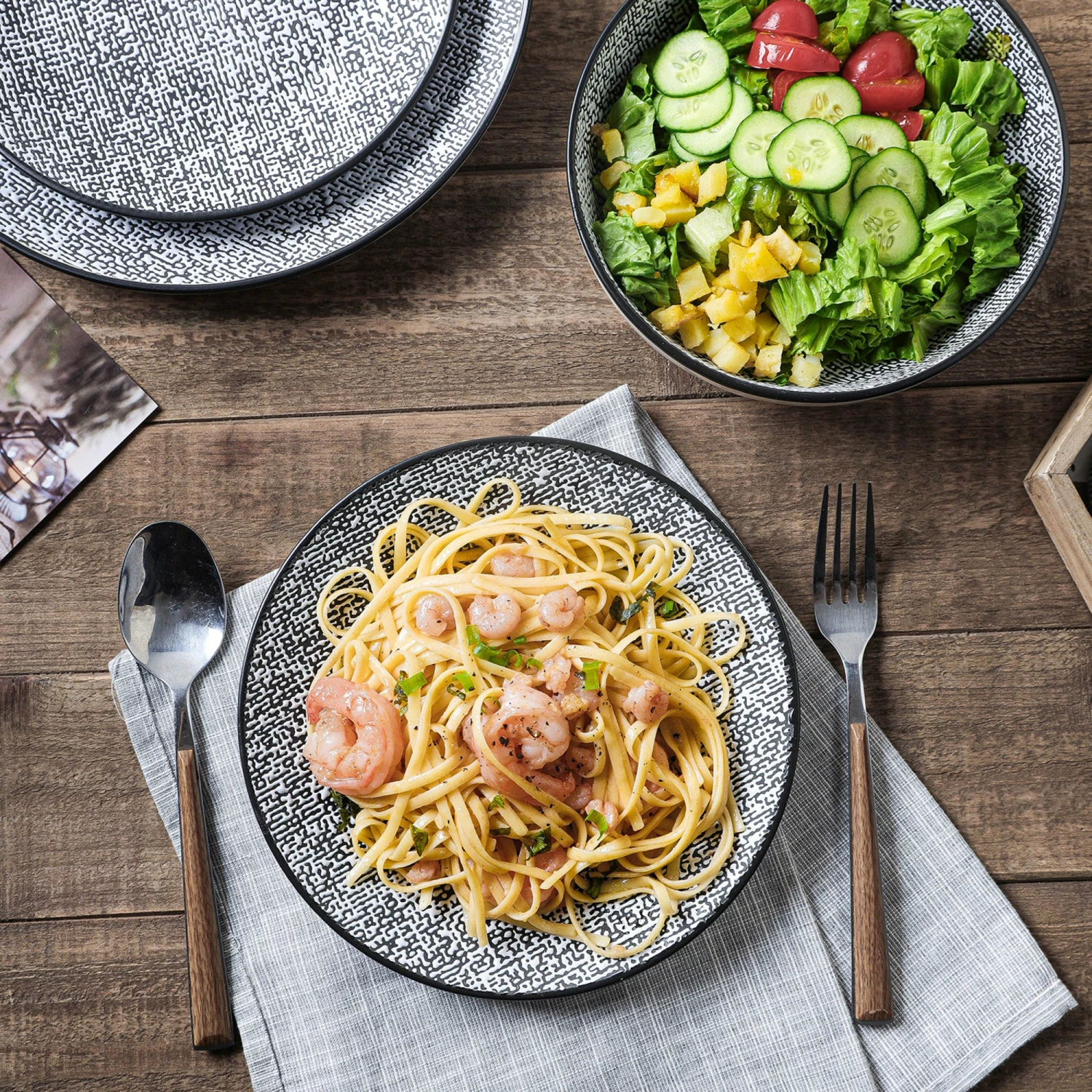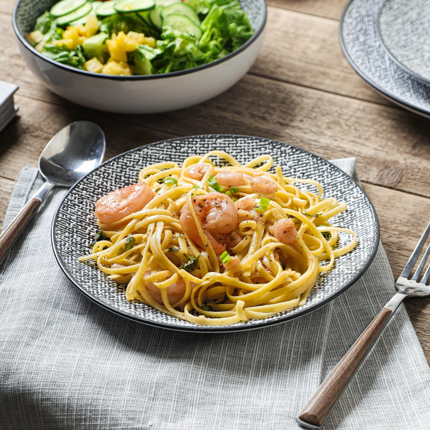 The Sophie stoneware dinnerware set is rustic with a fun textured design on the inside and a thick black rim, making each dish feel artsy and unique. The Stone Lain Sophie stoneware set includes low profile black and brown dishes, that are casual enough for every day dining and a great pair to comfort food. The neutral toned dishes fit into any traditional, farmhouse, or modern home or apartment. The collection includes large round 10.5” dinner plates, round 8” salad plates, soup or pasta bowls and cozy 12oz cups. Pair this set with your favorite cutlery and napkins, and you are ready to plate your food for a comforting and casual dining experience. Sophie is microwave and dishwasher safe, for easy reheating and cleaning. Grab a set today and experience fun dining at home.